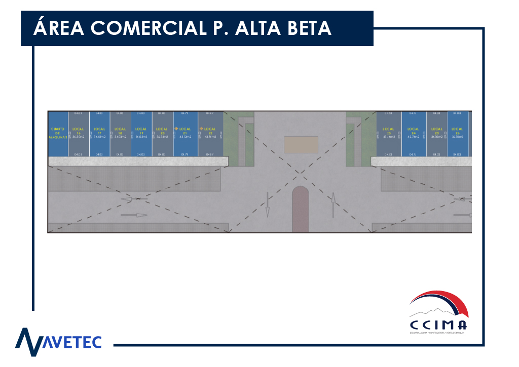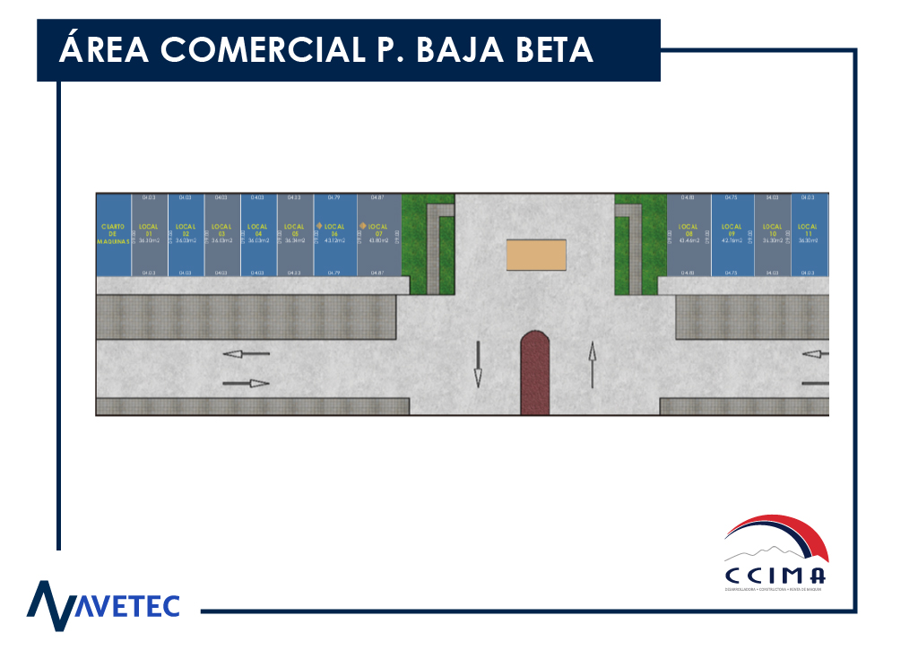Navetec Business Park Beta cuenta con un área comercial al costado del acceso el cual consta de 22 locales comerciales divididos en dos plantas.
